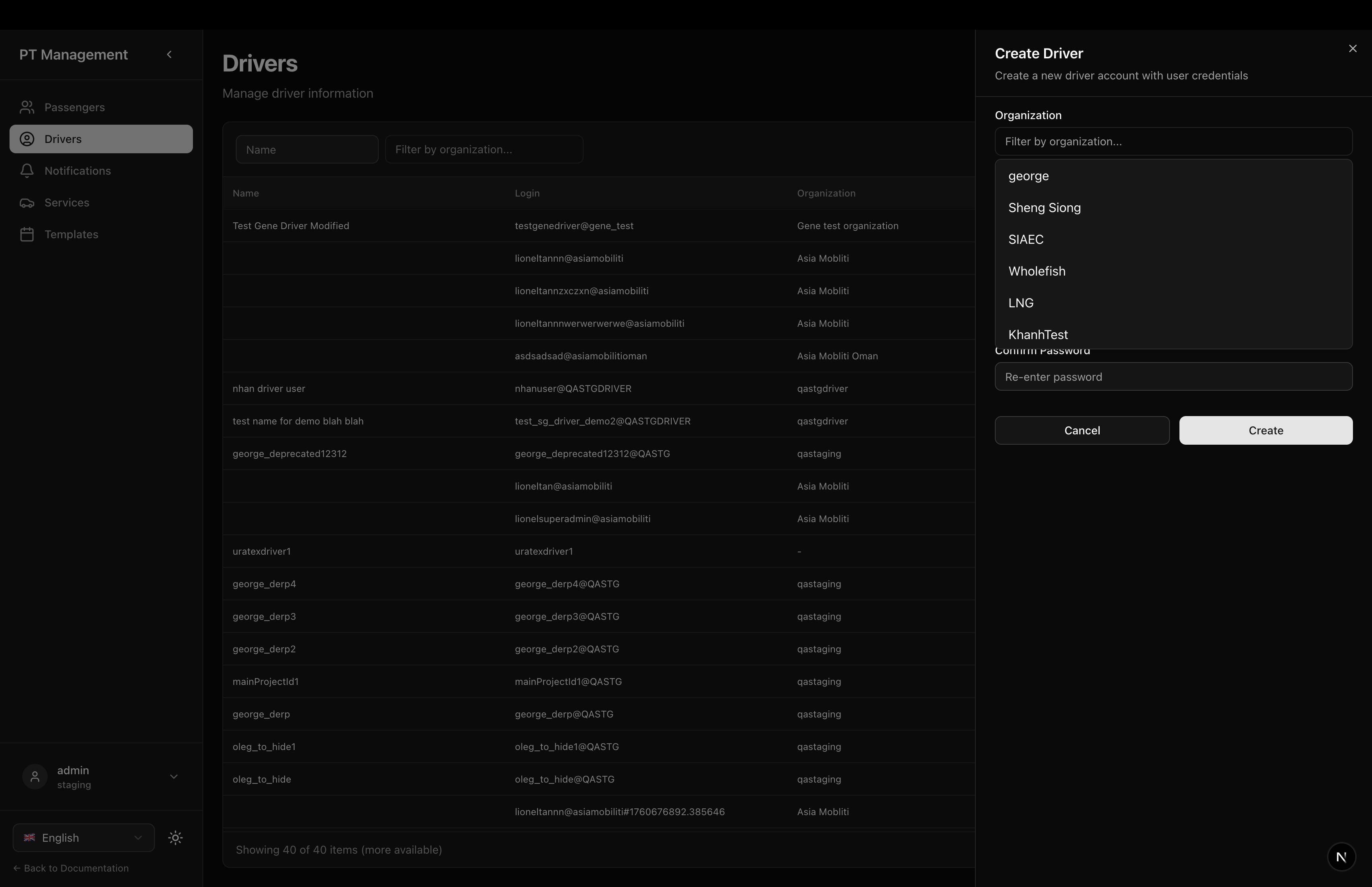 A complete driver management page with table display and integrated drawer for creating and editing drivers. Includes organization filtering and full CRUD functionality.